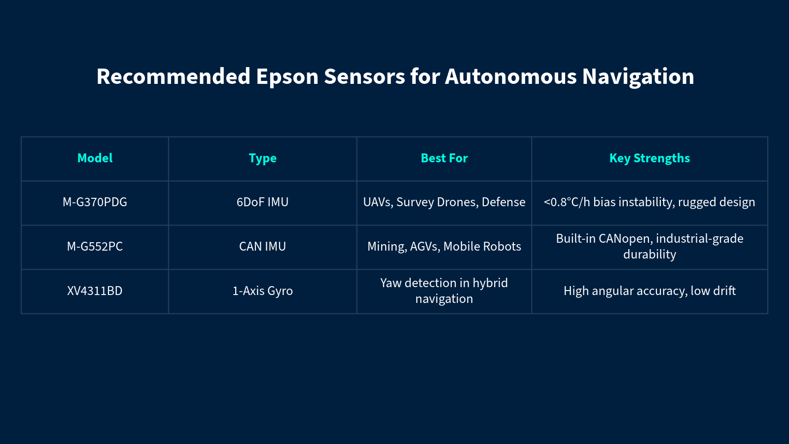 Inertial navigation systems built on Epson IMUs are redefining autonomy. Whether in the air, on land, or at sea – Epson's high-performance motion sensors enable real-time positioning and guidance even where GNSS fails. AMCORIS supports integrators in building resilient navigation architectures with proven sensor solutions tailored to unmanned systems and mobile robotics.