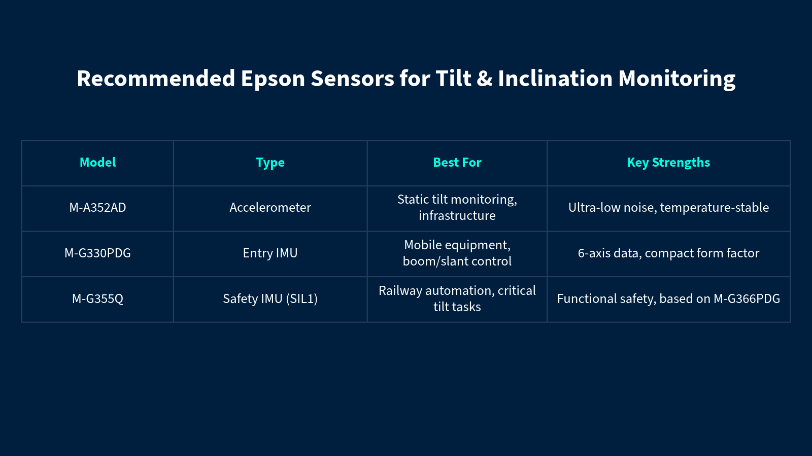 Precision tilt monitoring enables smarter automation and safer infrastructure. Epson’s high-resolution accelerometers and IMUs, available via AMCORIS, deliver reliable inclination data across rail systems, smart buildings, and mobile industrial equipment. With ultra-low noise and stable output under varying temperatures and vibration, these sensors allow real-time tilt monitoring in safety-critical and mission-driven environments.